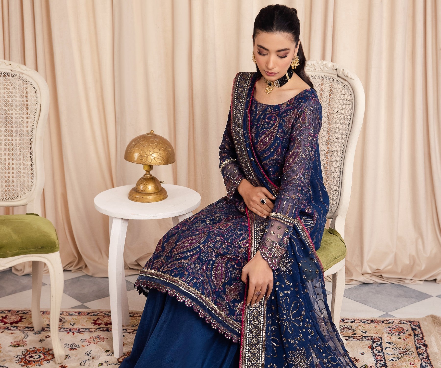 Dive into sophistication with our deep blue embroidered chiffon ensemble. The intricate details on the shirt front and sleeves speak volumes of elegance. Paired with a mesmerizing chiffon dupatta featuring