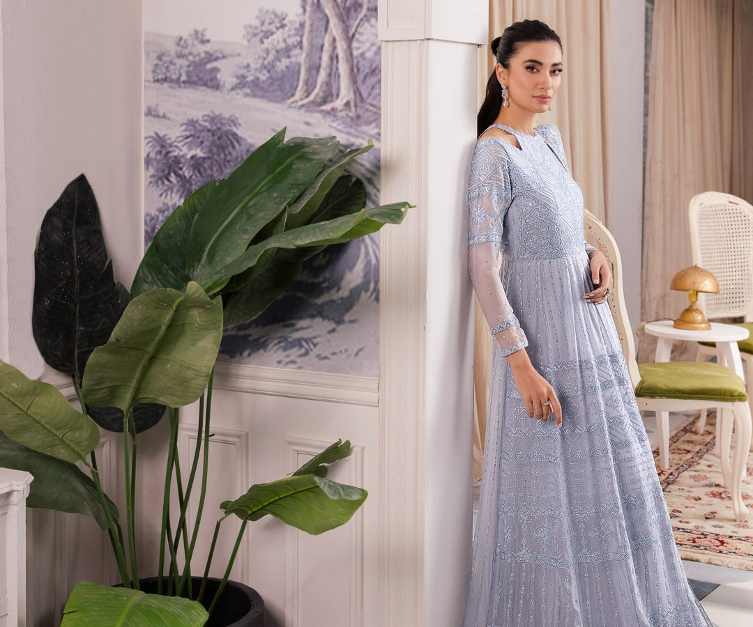 'Bareen' captures the essence of grace and sophistication. This captivating attire boasts an intricately embroidered shirt, front and back,
