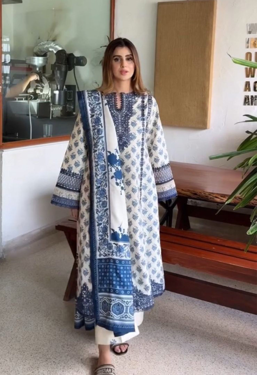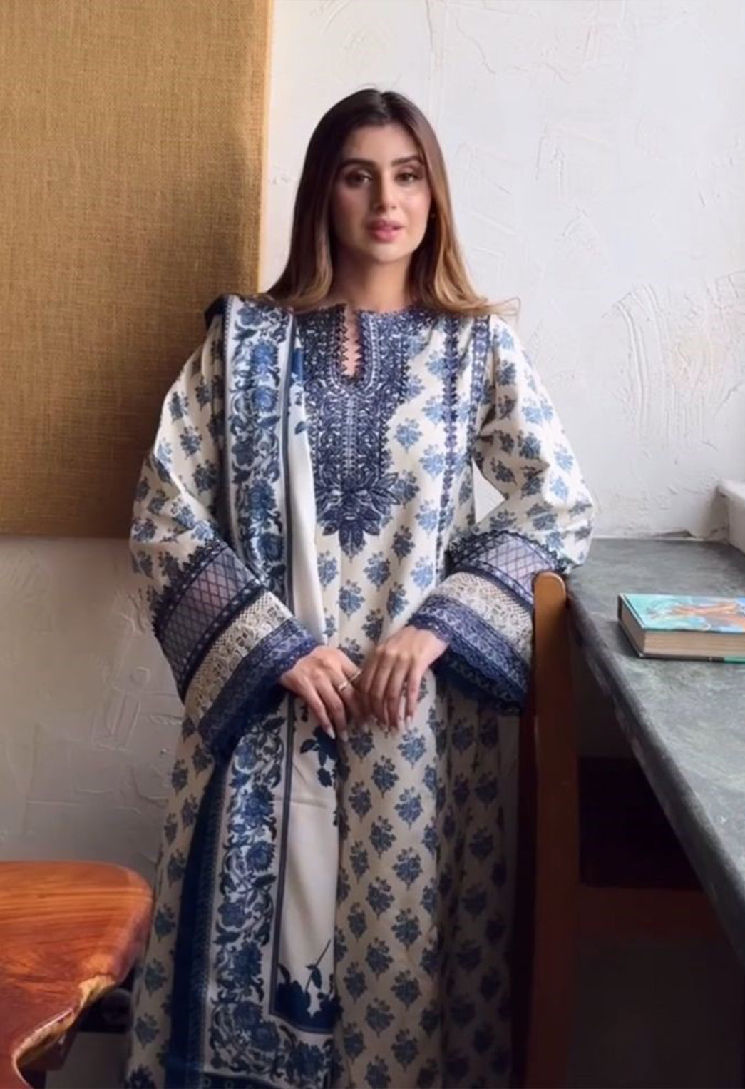 Blue Serenity brings a soothing blend of blue and ivory. The printed viscose linen shirt features an embroidered organza neckline, panel lace, and layered sleeves, paired with a printed trouser and printed jute shawl for effortless style.