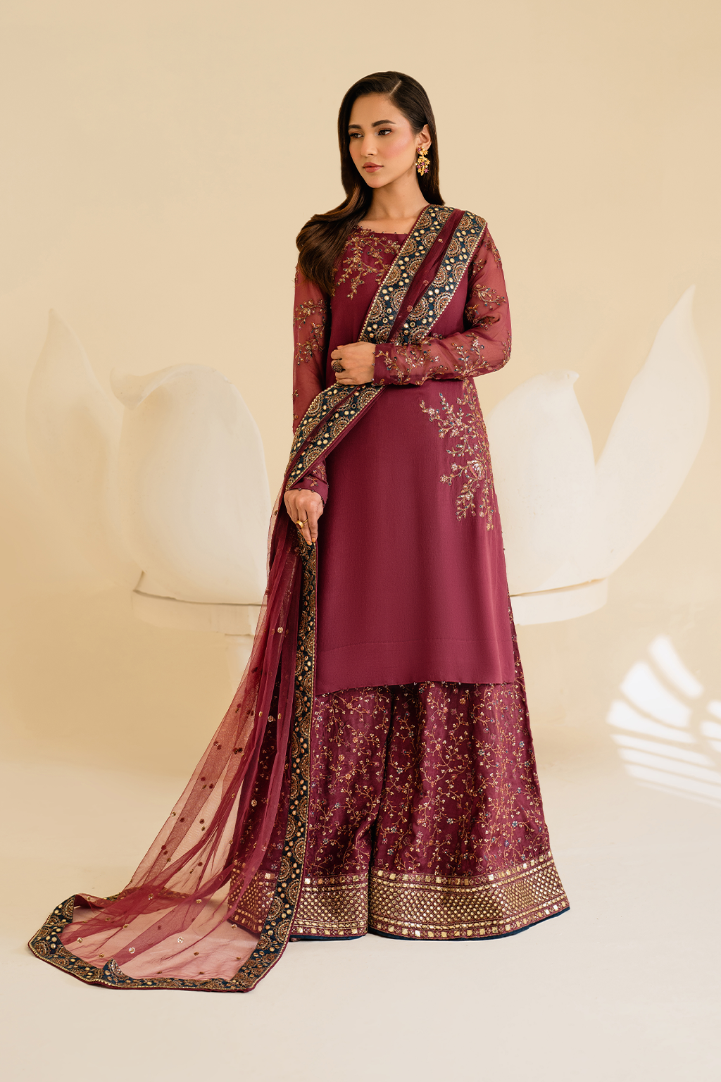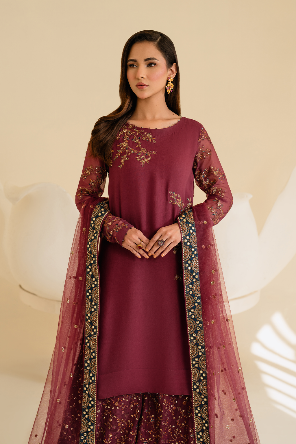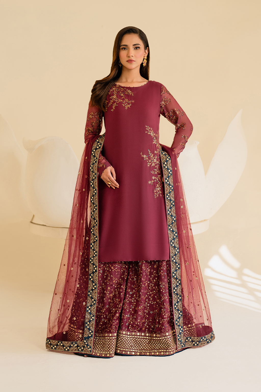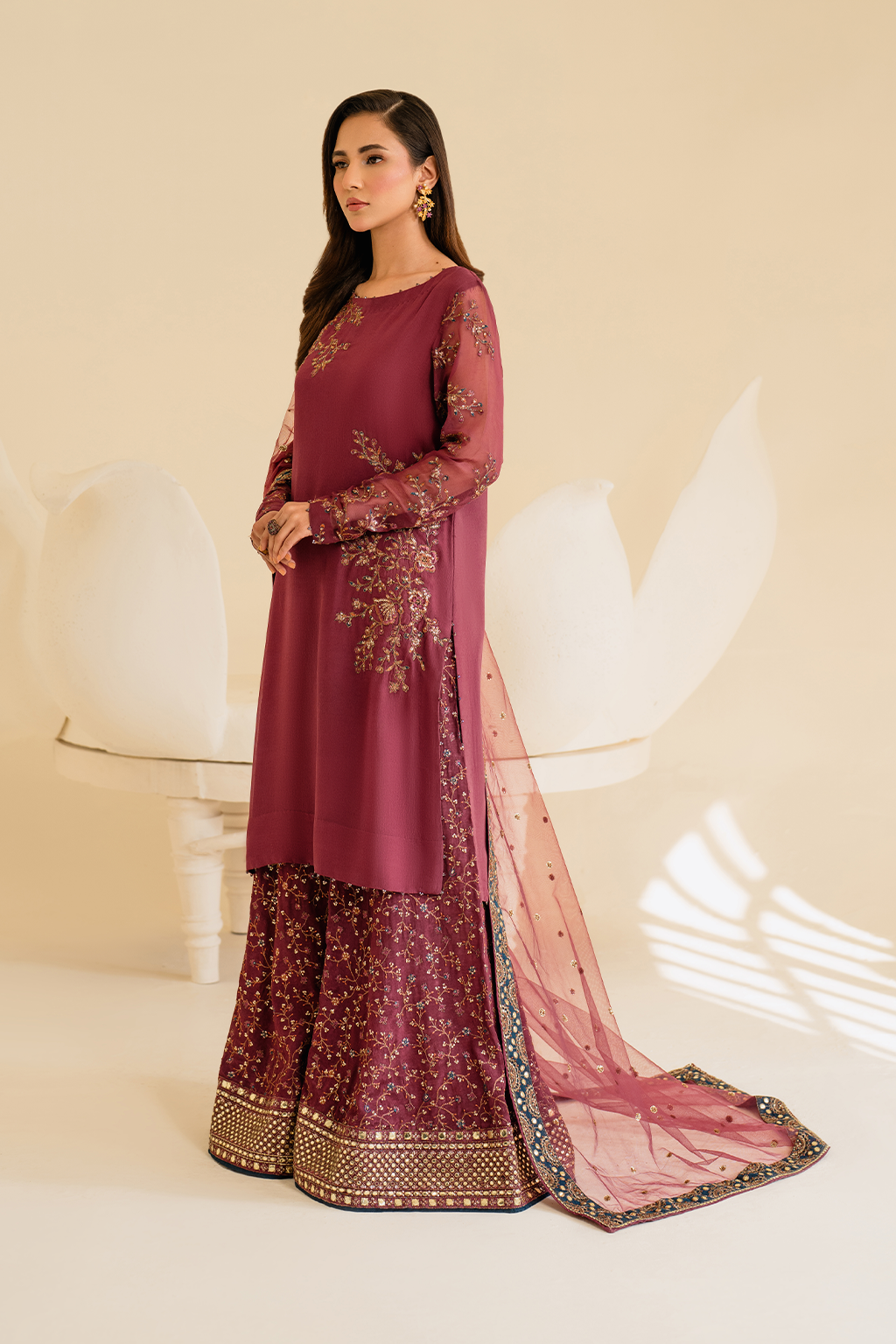 Type: 3 Piece Fabric: Chiffon Shirt: Short Shirt Dupatta: Embroidered Net Sharara: Embroidered Raw Silk Includes: Shirt, lining, Dupatta, and Sharara With Accessories