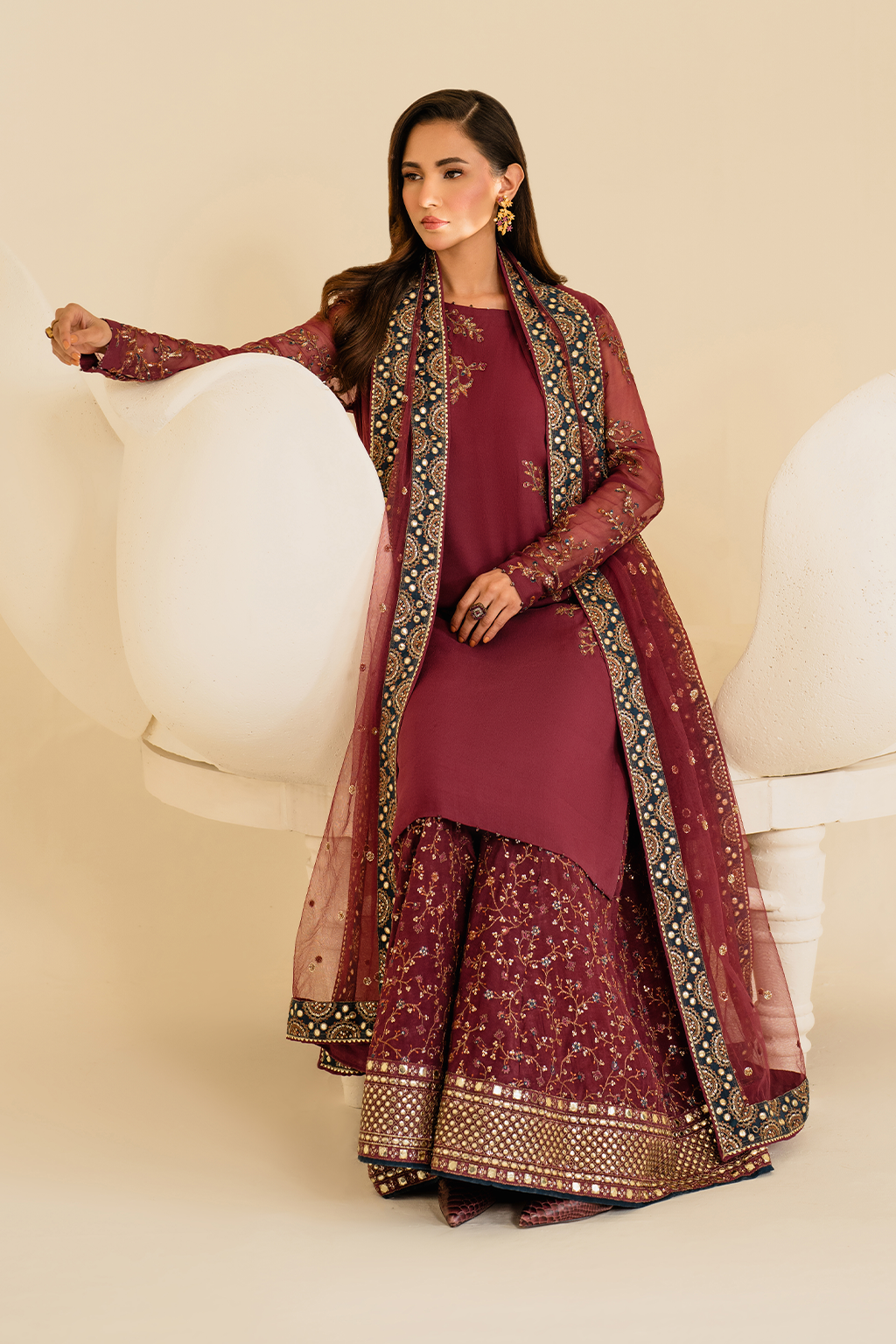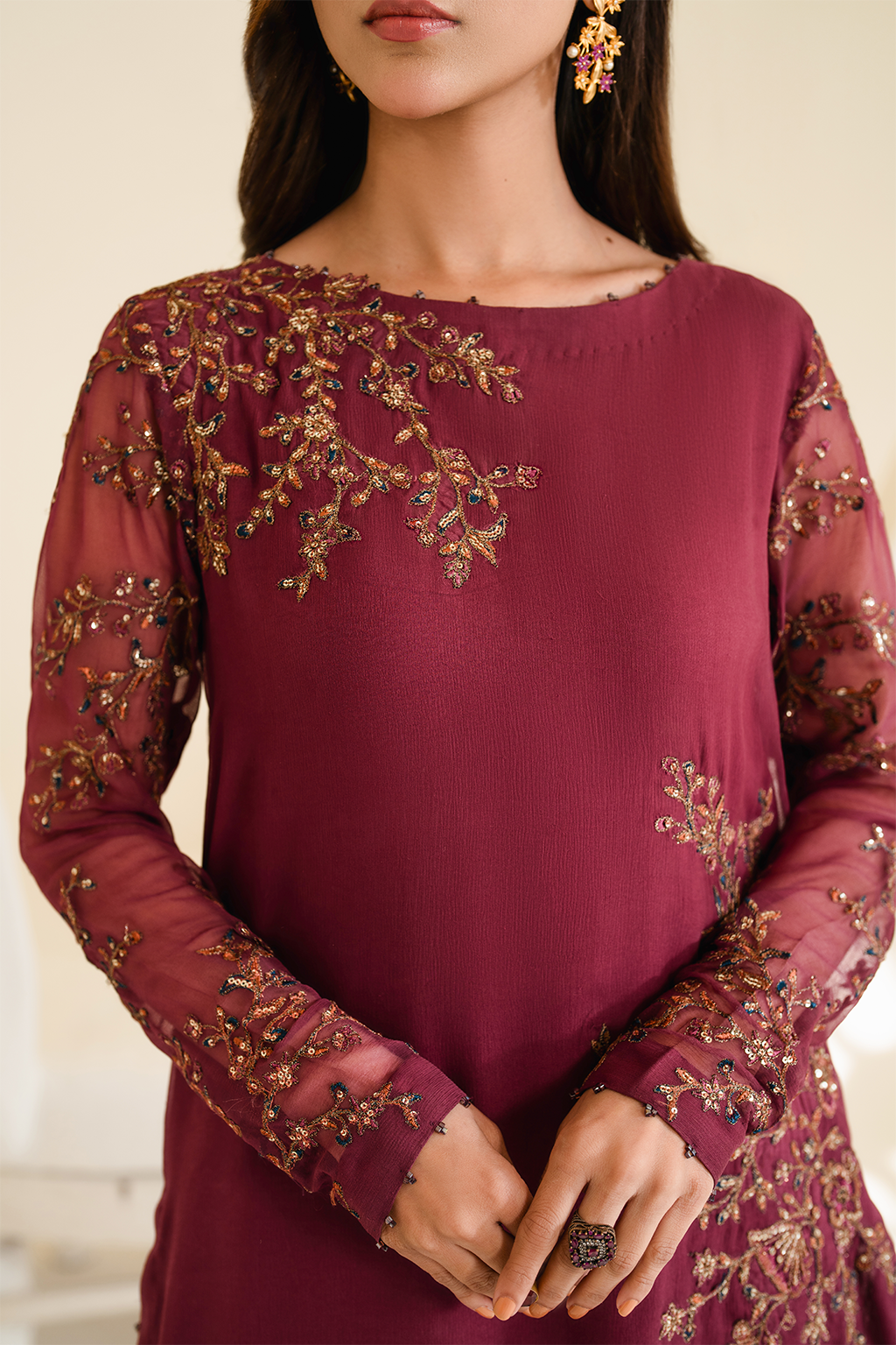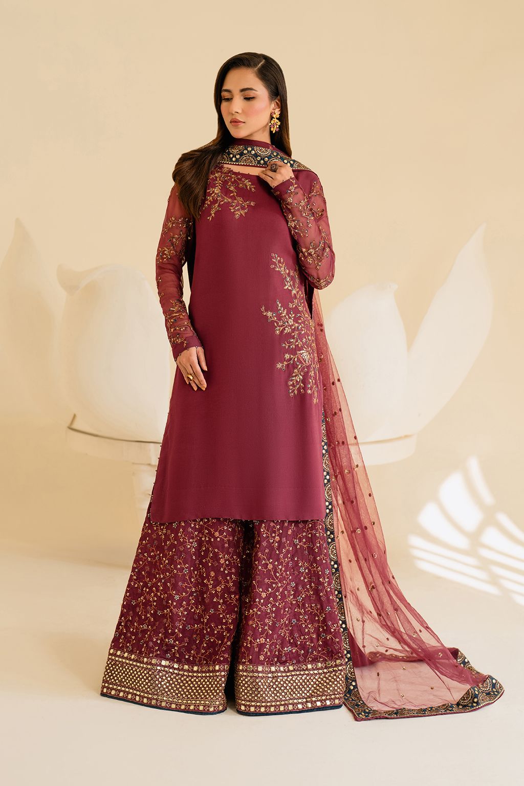 Type: 3 Piece Fabric: Chiffon Shirt: Short Shirt Dupatta: Embroidered Net Sharara: Embroidered Raw Silk Includes: Shirt, lining, Dupatta, and Sharara With Accessories