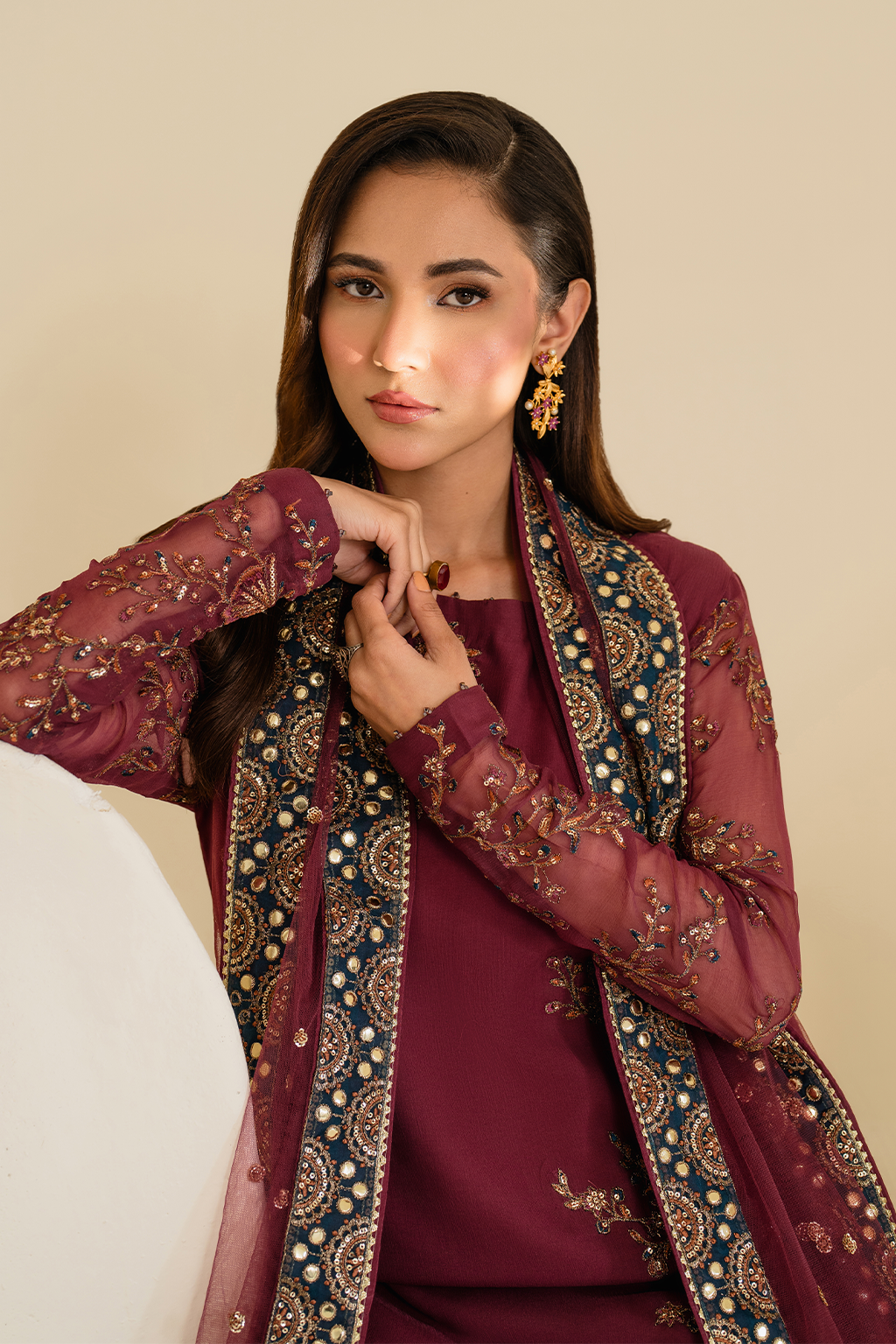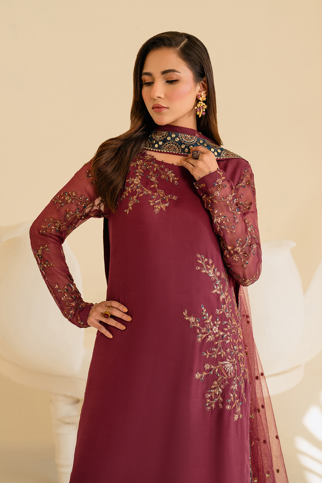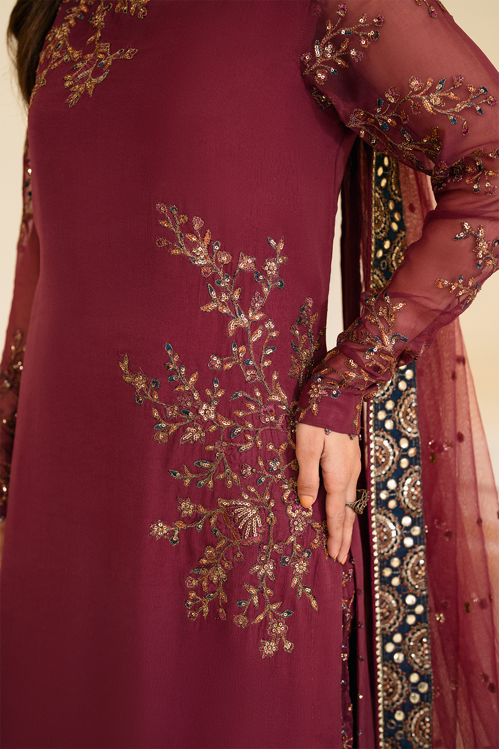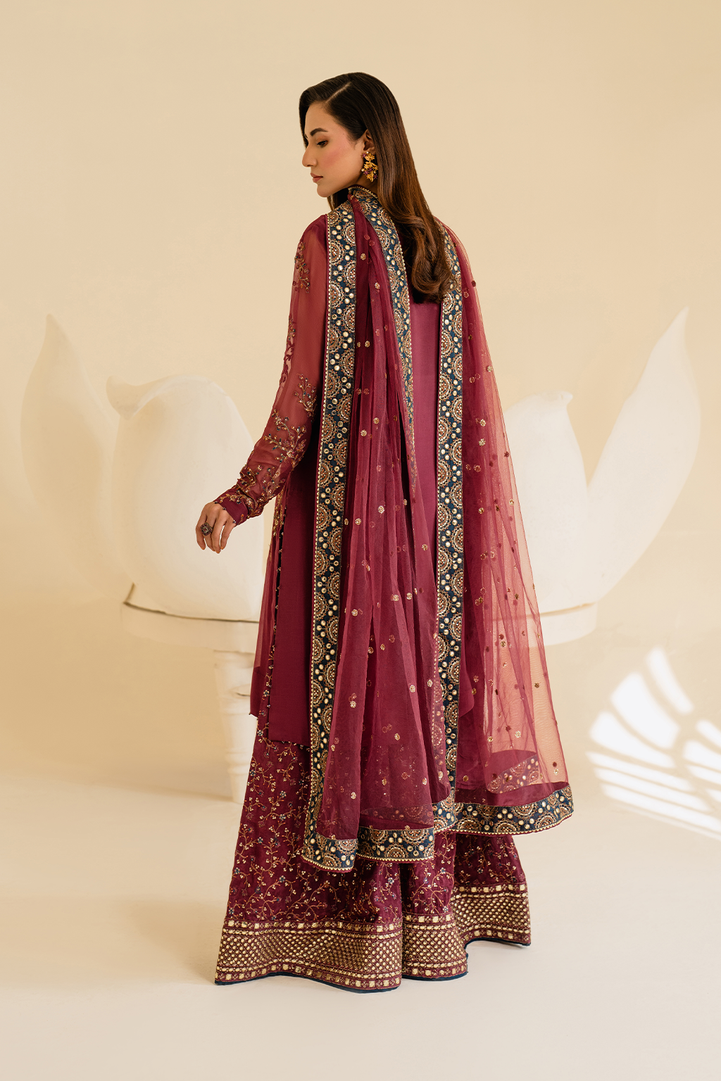 Type: 3 Piece Fabric: Chiffon Shirt: Short Shirt Dupatta: Embroidered Net Sharara: Embroidered Raw Silk Includes: Shirt, lining, Dupatta, and Sharara With Accessories