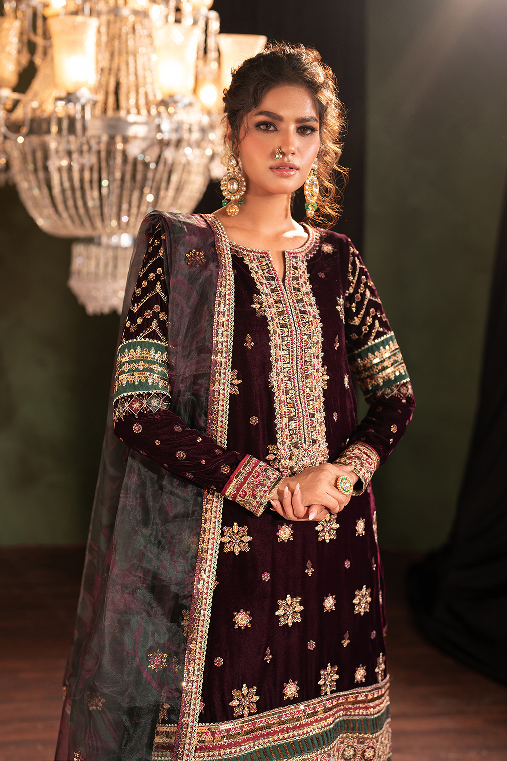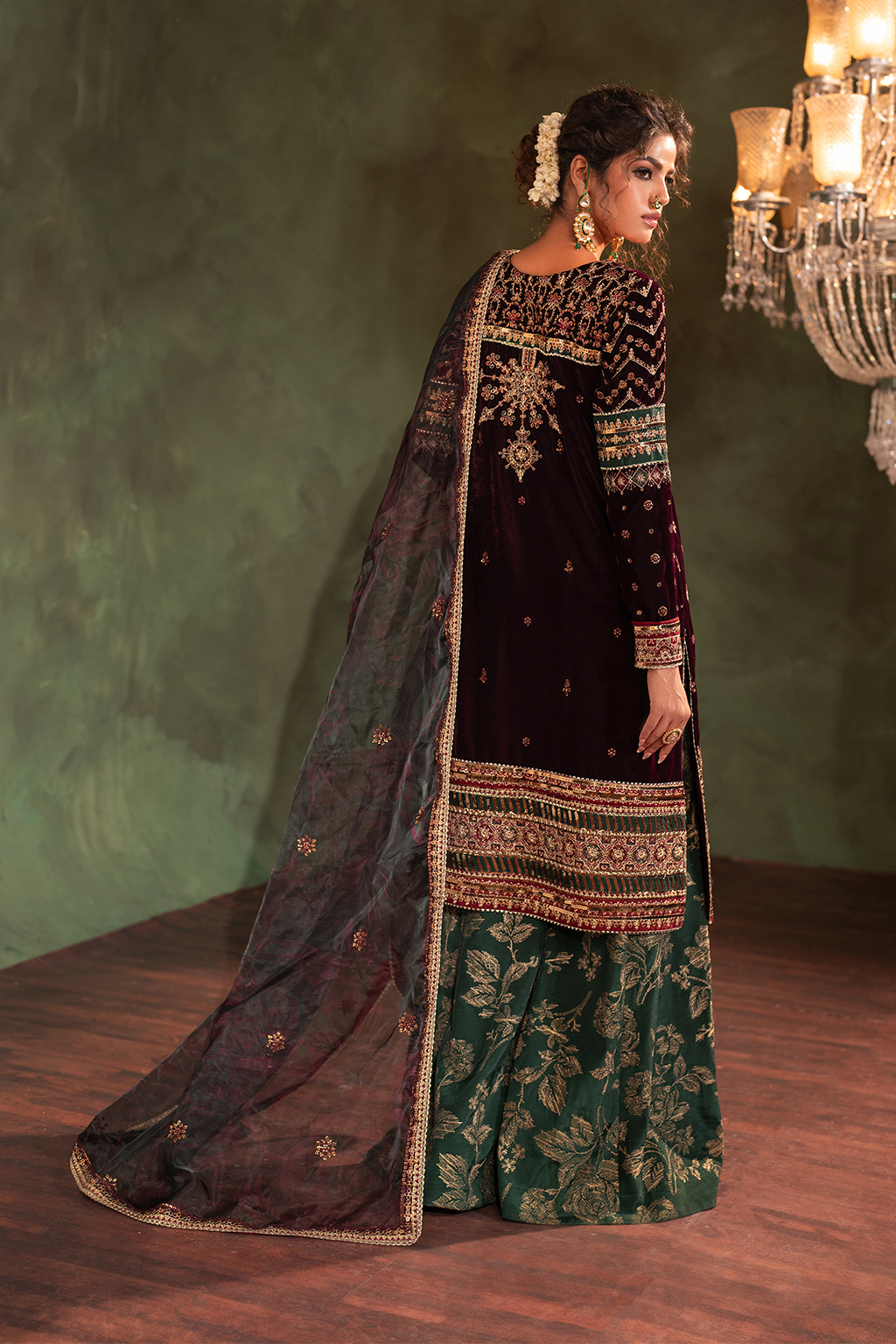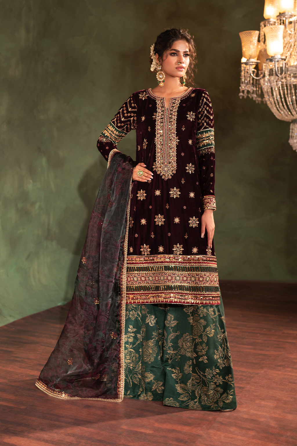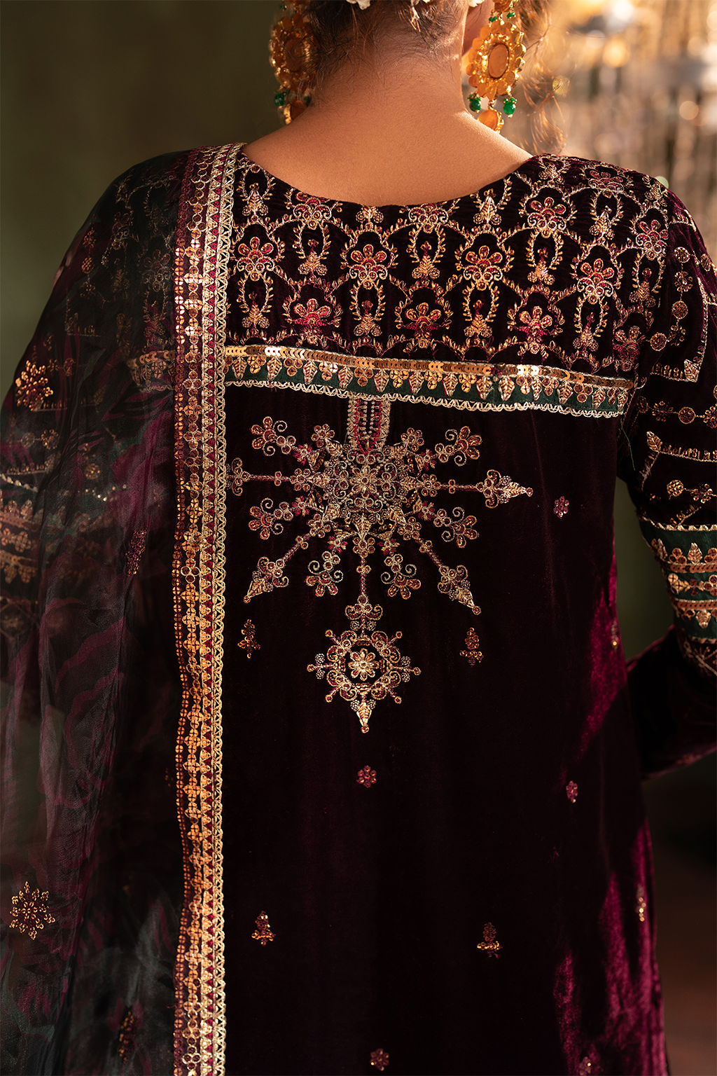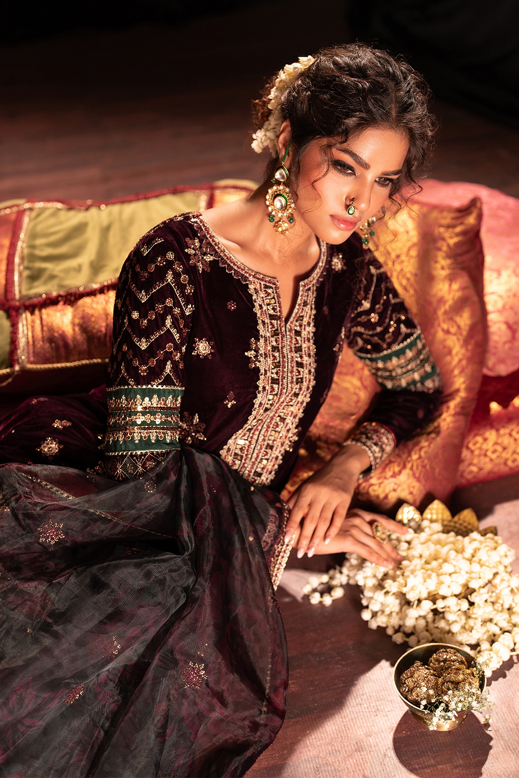 Shirt Front: Embroidered VelvetShirt Back: Embroidered VelvetSleeve: Embroidered VelvetNeckline: Embroidered OrganzaFront & Back Lace1: Embroidered Silk (1.5M)Front & Back Lace2: Embroidered Silk (1.5M)Front & Back Lace3: Embroidered Organza (1.5M)Back Body Lace: Embroidered Silk (0.5M)Slevees Lace1: Embroidered Silk (0.9M)Slevees Lace2: Embroidered Silk (0.9M)