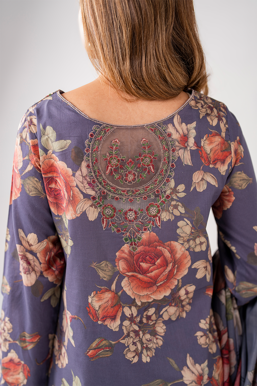 Shirt & Trouser: Printed Lawn Front Neckline: Embroidered Organza(1 Pc) Back Neckline: Embroidered Organza(1 Pc) Front Lace: Embroidered Organza(0.85 M)